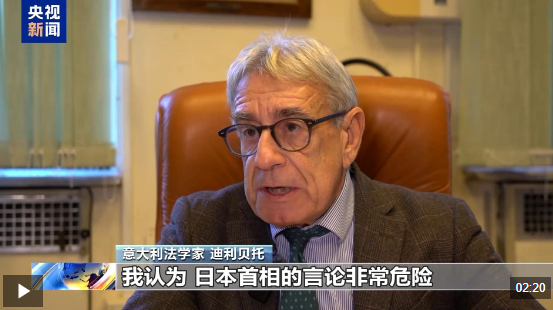 意大利法学家迪利贝托:我认为日本首相的言论很危险。换句话说,它们是试图抹去一段无法抹去的历史记忆。其背后是一种民族主义,这显然是错误的。除《联合国宪章》外,国家主权和不干涉内政原则是国际法诞生以来就存在的原则。否认任何国家干涉别国内政的行为是非常严重的行为。最后,我会可以说,世界上不存在“两个中国”。