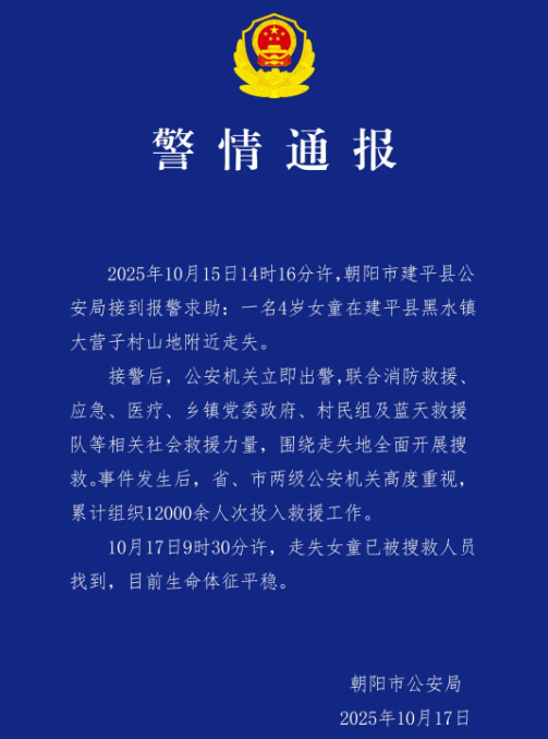 中国网10月17日电,辽宁朝阳市公安局10月17日发布警方信息通报:2025年10月15日14时16分左右,朝阳市建平县公安局接到求助报警:建平县黑水镇大营子村山附近,一名4岁女童失踪。接到报警后,公安机关立即出动警力,会同消防救援、应急、医疗、人民党委政府、村民小组、蓝天救援队等相关社会救援力量,在失联地区周边开展全面搜救。事件发生后,省、市公安机关高度重视,组织12000余人参与救援工作。 10月17日9时30分左右,失踪女孩被搜救人员找到,目前生命体征稳定。 【责任编辑:刘菊恩灵]